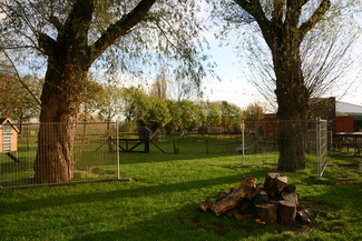 Aanzicht van de boerderij en de speeltuin. |