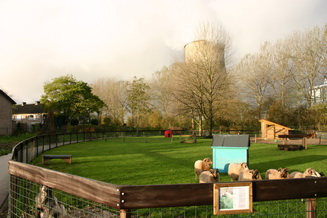 Aanzicht van de boerderij en de speeltuin. |